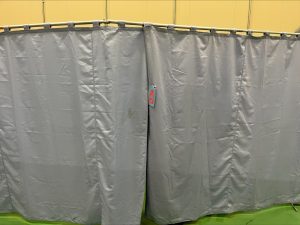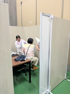 物流センターの一角にパーテーションで臨時接種会場を設置しました。)