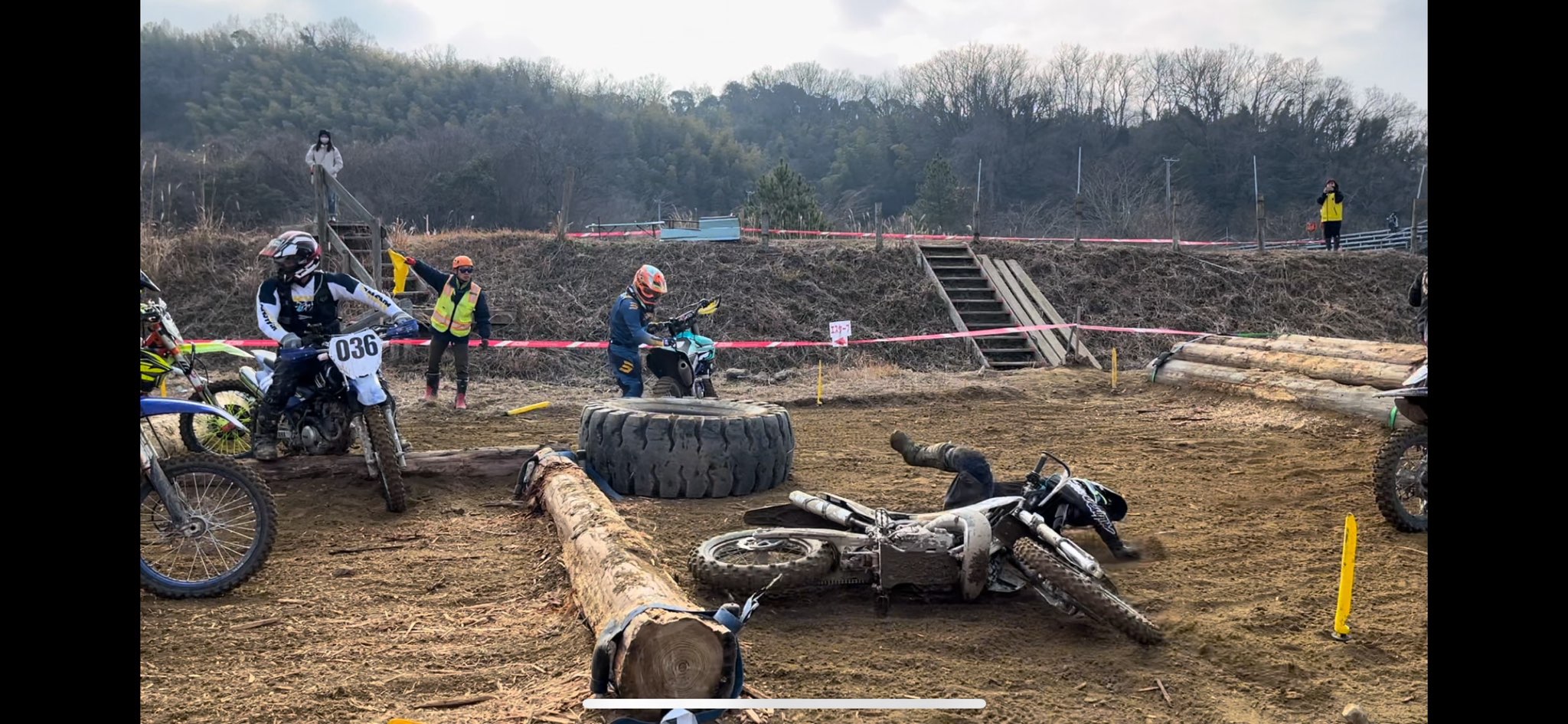 泥で左手が外れて転倒したり、丸太を越えたあとのお釣りで転倒したり・・・