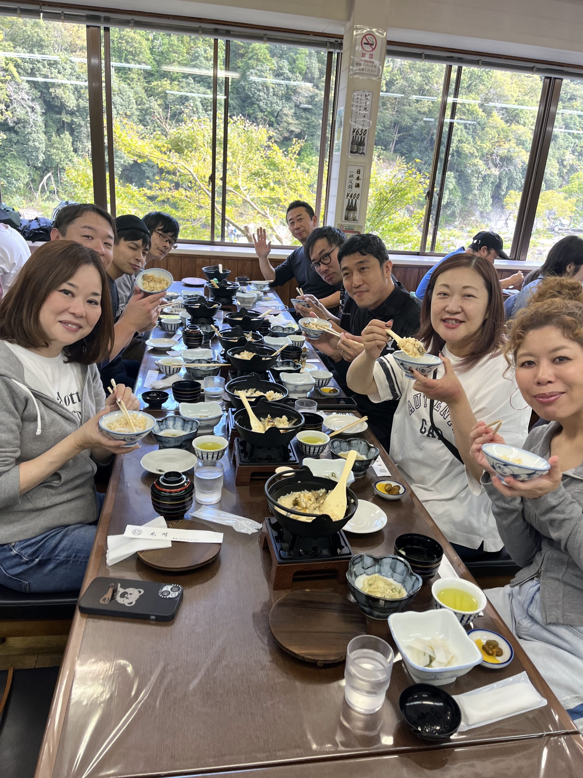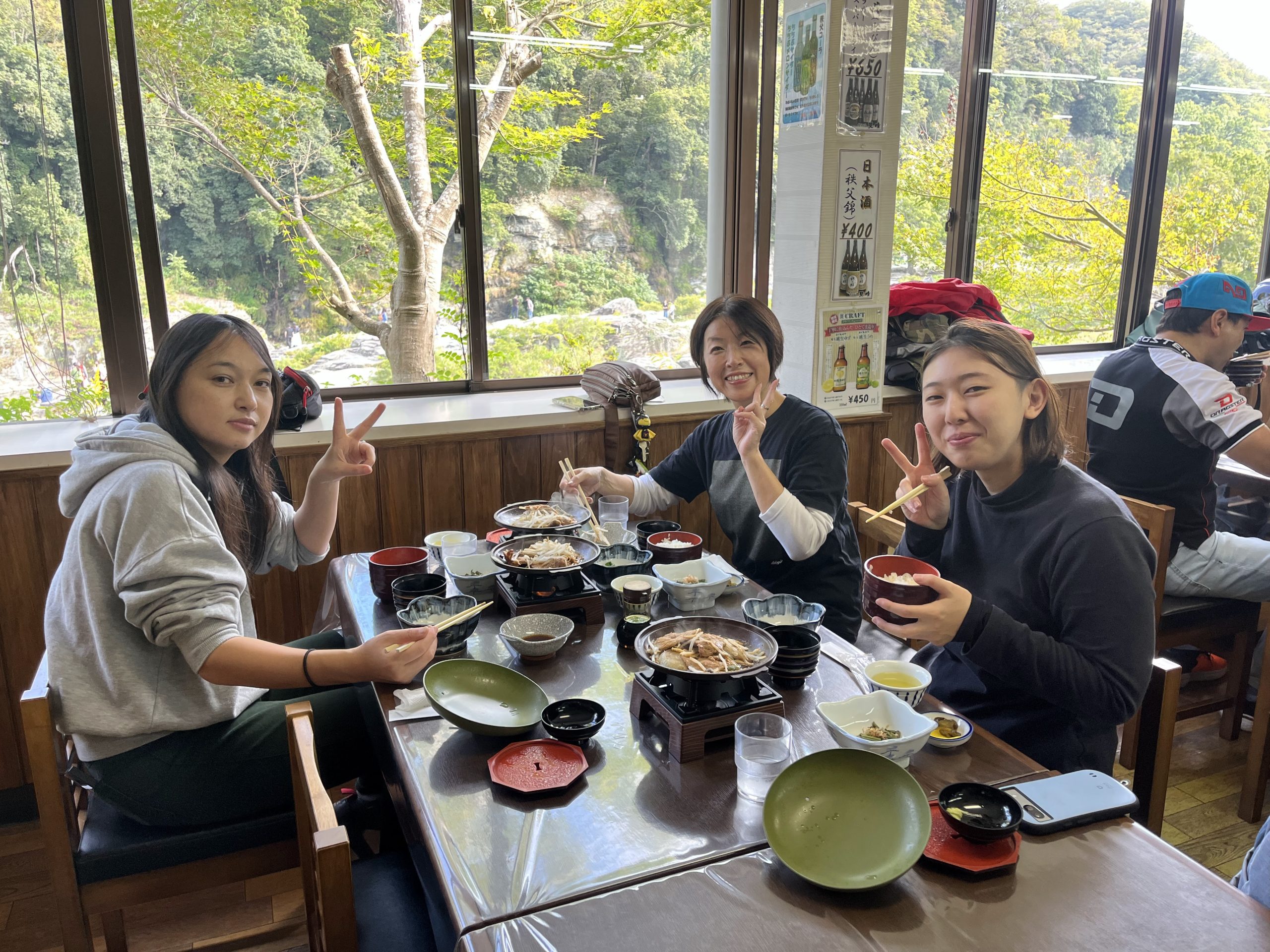 見晴さんでは岩畳を眺めながら食事ができる席に座り、鮎料理や釜めし、豚味噌漬けの陶板焼きなどをいただきました。目も舌も美味しい!