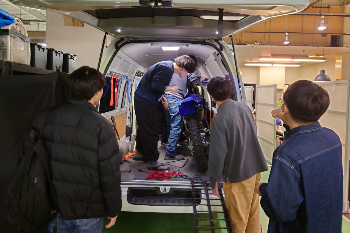前日の積み込み作業! 自車やレンタル車両をトランポに収納していきます