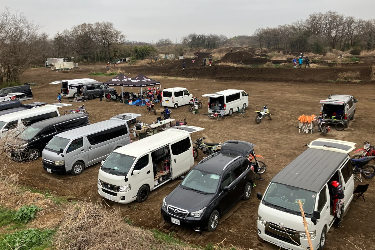 参加者の車両がズラッと陳列! 奥に見えるのがモトクロスコース