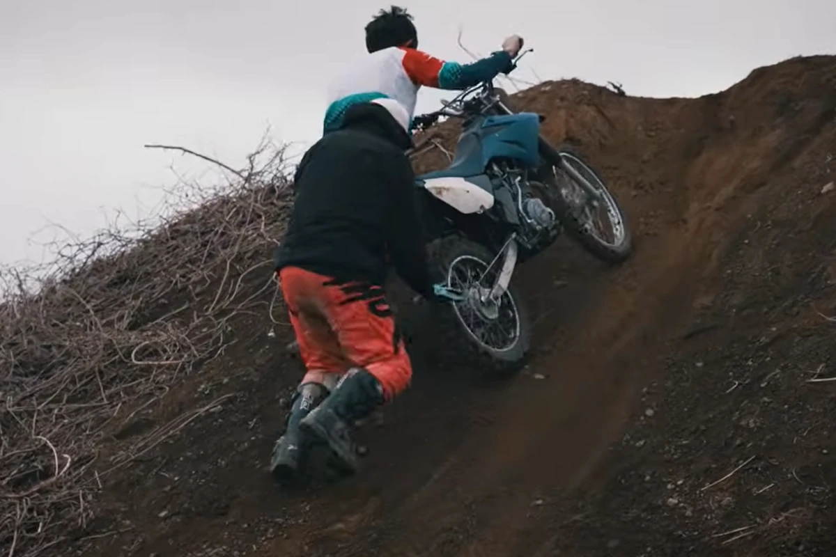 リバークレインのオフ運動会では、正午から13時の間はエンジンをかけないのがマナー。お昼ご飯を食べるも良し、休憩するも良し、みんなとダラダラだべるも良しです。だがしかし! エンジンをかけずとも遊べちゃうのがオフロードの良いところ。(だと個人的には思っている。)お昼の最中には、「急勾配な激坂をどこまでバイクを押して登れるのか」大会が突如始まったわけです。これ、エンジンをかければ楽勝なのですが、人力で100キロを超える鉄の塊を押して登るわけで、相当キツいんです。