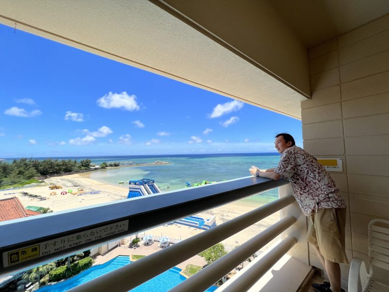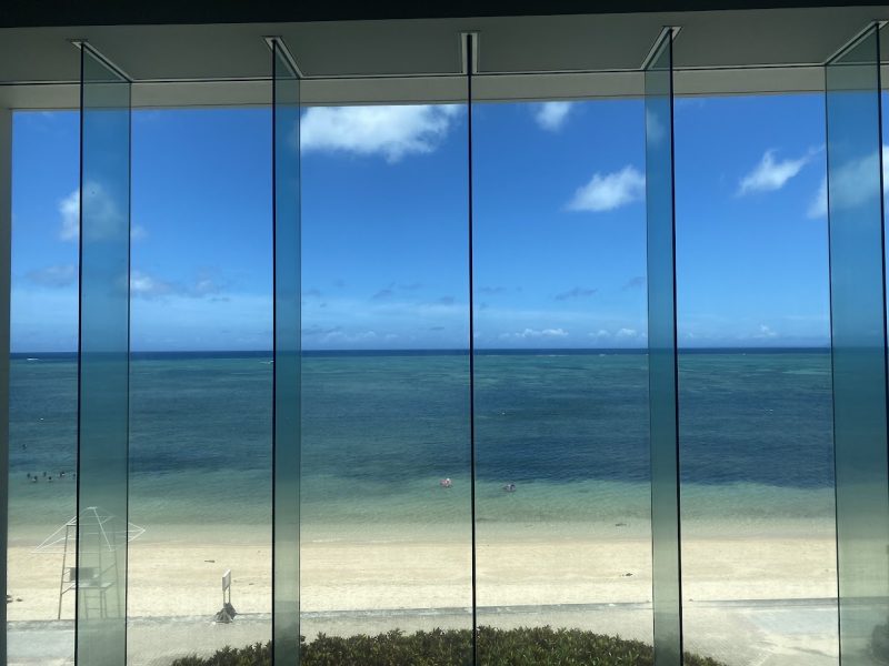 宿泊したのはロビーからオーシャンビューが望めるビーチ付きのホテル。「あぁ、いま沖縄にいるんだな」とリゾート感に浸れる最高のホテルでした。